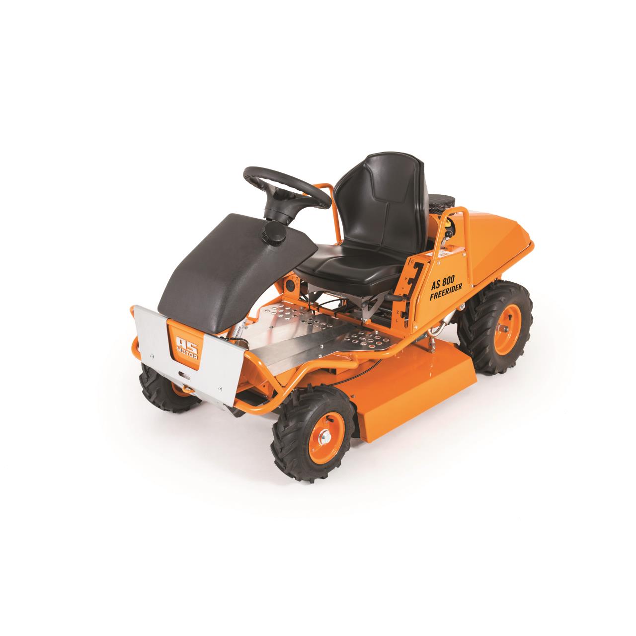 Einen stufenlosen Fahrantrieb ermöglicht der Hydrostat mit Geschwindigkeiten von 0,0 – 8,0 km/h vorwärts und 0,0 – 6,0 km/h rückwärts. Eine optimale und sensible Anpassung der Geschwindigkeiten an jeden Einsatz wird hierdurch ermöglicht. Für besten Vortrieb, vor allem in unebenem Gelände, bietet sich die Differenzialsperre an. Diese ist jederzeit per Fußpedal zuschaltbar. Der umlaufende Rohrrahmen des AS 800 FreeRiders sorgt für hohe Stabilität und Verwindungssteifigkeit auch bei harter Belastung. Zusätzlichen Schutz der Achsen und Radaufhängungen bietet der Stoßfänger. Eine aufrechte, bequeme Sitzposition wird dem Benutzer durch den nach vor vorne und hinten verstellbaren Schalensitz und die daraus resultierende Beinfreiheit gewährt. In Kombination mit der leichtgängigen Lenkung ist ein ermüdungsfreies Arbeiten möglich. Maximal ist eine Flächenleistung von 6.800 m² pro Stunde erreichbar. Diese resultiert aus der Motorleistung in Kombination mit dem Hydrostat-Antrieb und der Schnittbreite von 80 cm. Der 15-Liter-Tank sorgt zudem für eine hohe Reichweite. Ideal lässt sich der AS 800 FreeRider sowohl in flachem als auch auf unebenem Gelände einsetzen. Durch den mit Benzin- und Ölpumpe ausgestatteten Motor, dem tiefen Schwerpunkt und dem leichten Gesamtgewicht von 227 kg ist der Aufsitzmäher bedingt hangtauglich. Die Grenzen werden hier durch die Sicherheit des Benutzers gesetzt.